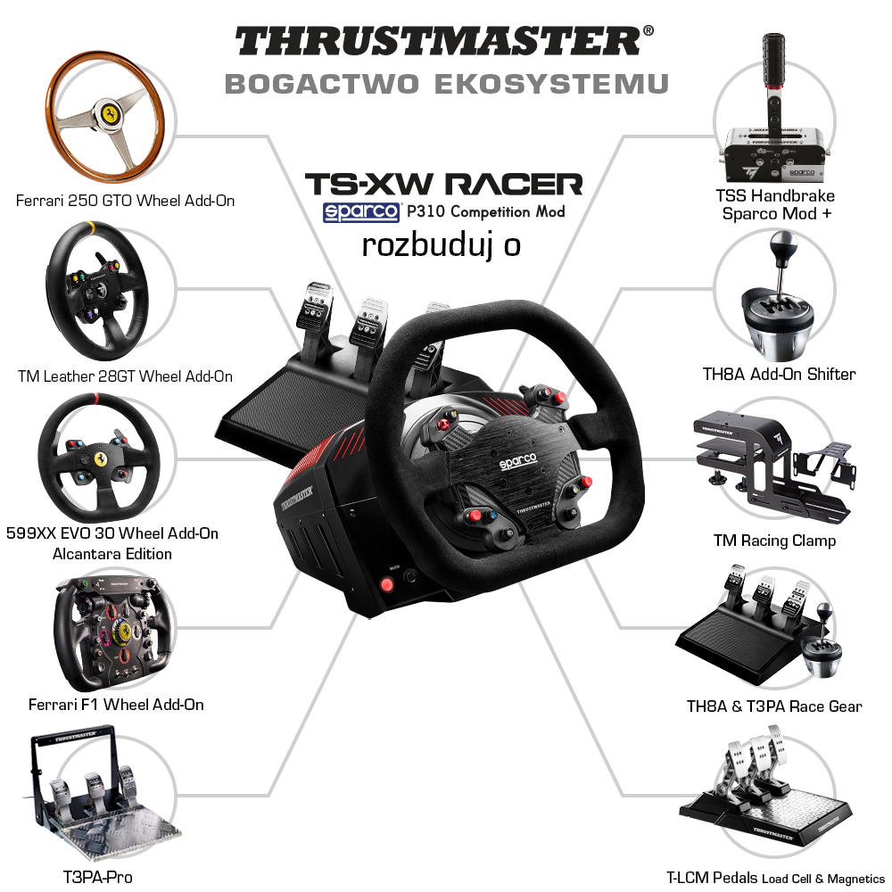 Co charakteryzuje system Thrustmaster to jego elastyczność. Dzięki szybko złączu możesz też zdjąć koło kierownicy i zamontować inne kompatybilne. Zobacz jaki zestaw możesz podłączyć do tej kierownicy.